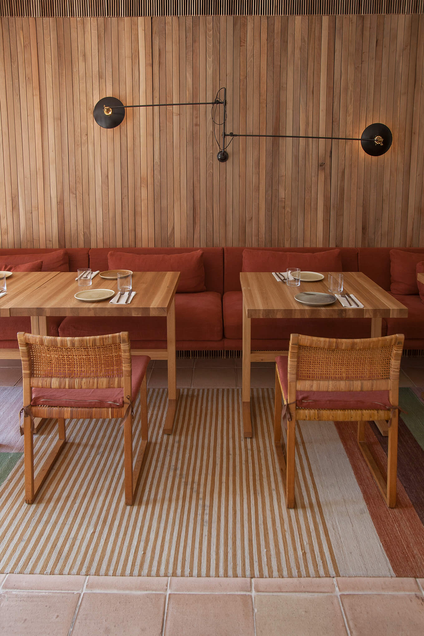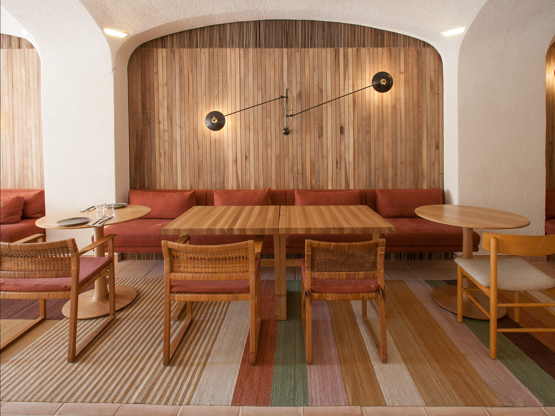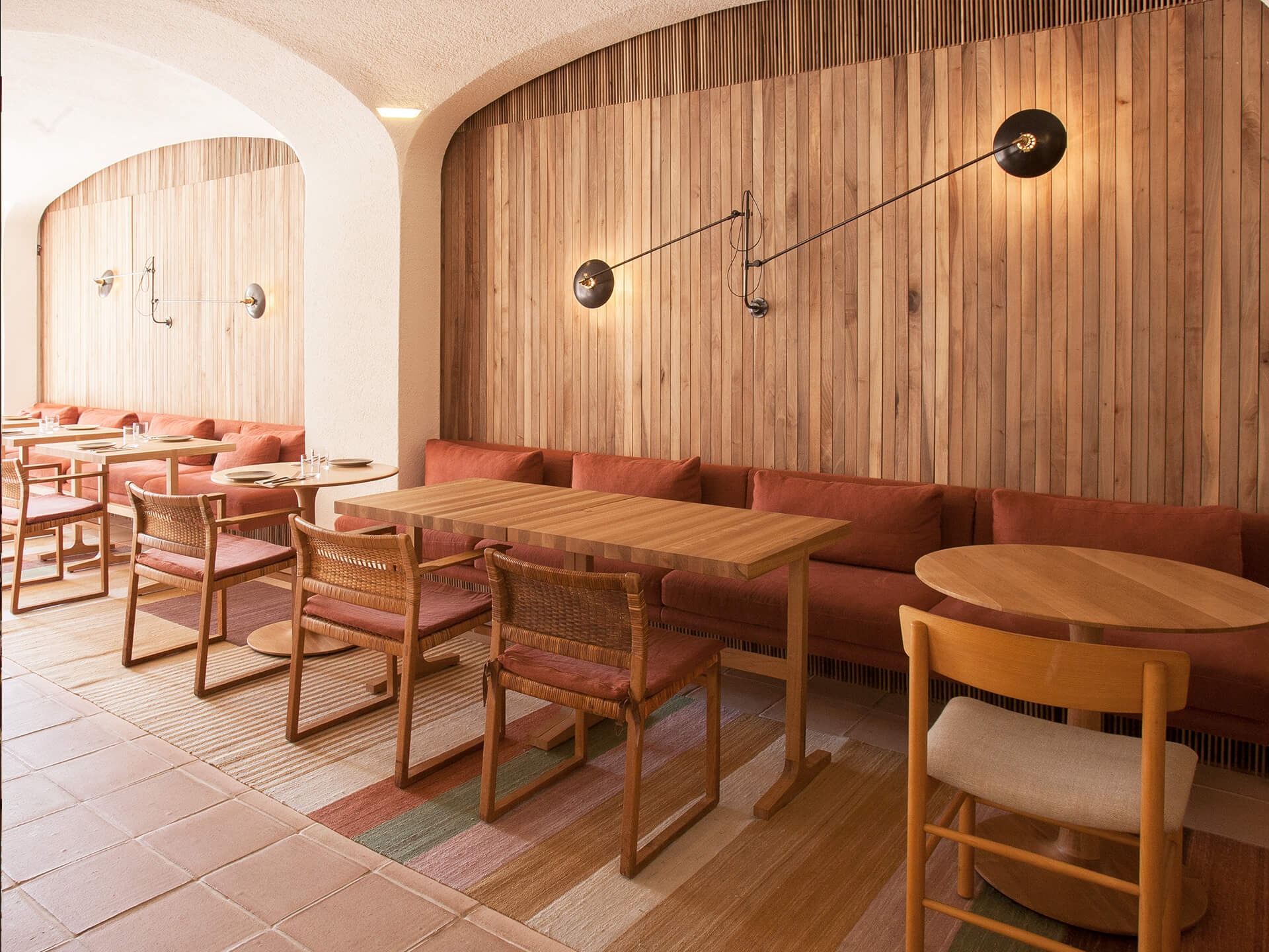 La sala principal del restaurante es un espacio abierto, repleto de amplias mesas de madera, muebles y accesorios cuidadosamente seleccionados presentados en armonía con la arquitectura del edificio, hecho que ejemplifica el gran cuidado por el detalle del arquitecto Isay Weinfeld. En esta ocasión, las alfombras aportan calidez y una sensación hogareña al restaurante. Los kilims Medina han sido creados en diferentes colores y tamaños especiales para integrar el comedor lateral. Las alfombras Chobi en diferentes tonos tierra también se han combinado en el área de recepción.