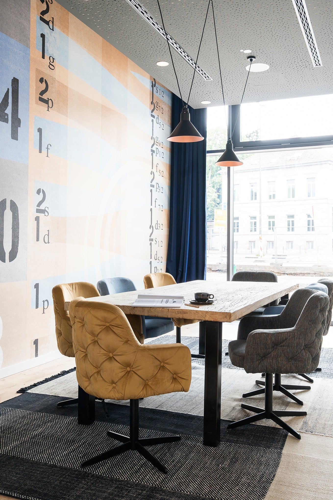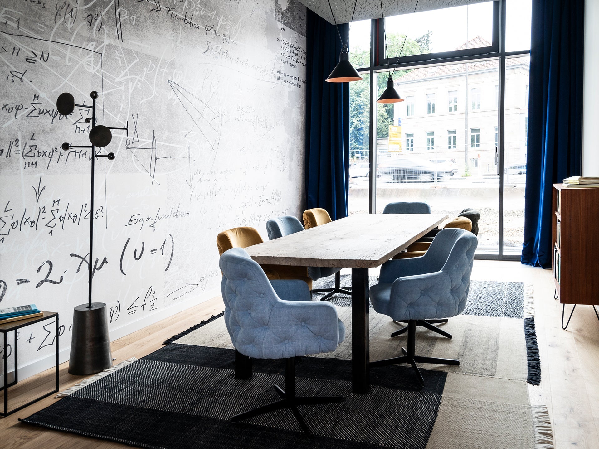 Los espacios públicos fomentan el espíritu comunitario con zonas de asientos agrupados con sillones de gran tamaño y sofás de terciopelo azul. Las baldosas de cemento marroquí de colores ocupan un lugar destacado en estas zonas, al igual que el uso de vidrio azul. Las alfombras diseñadas a medida por Nani Marquina son el distintivo del espacio para eventos ''Wohnzimmer'' y también de las suites.