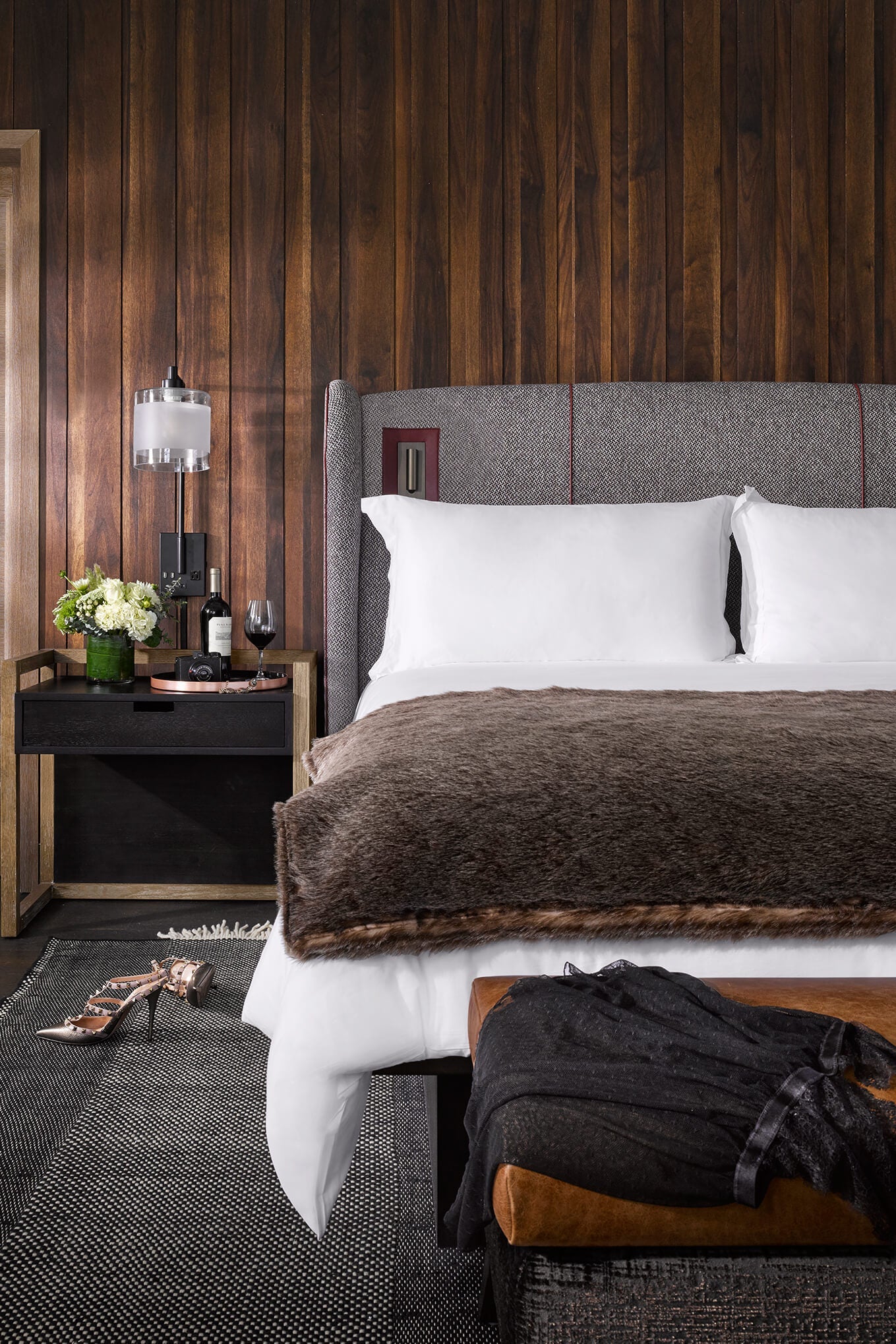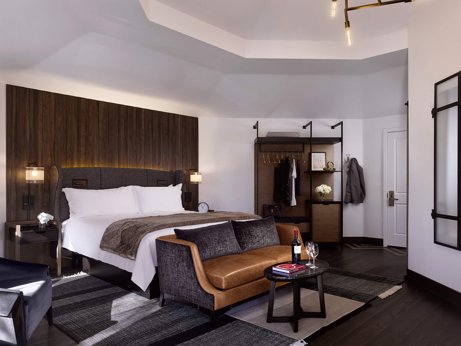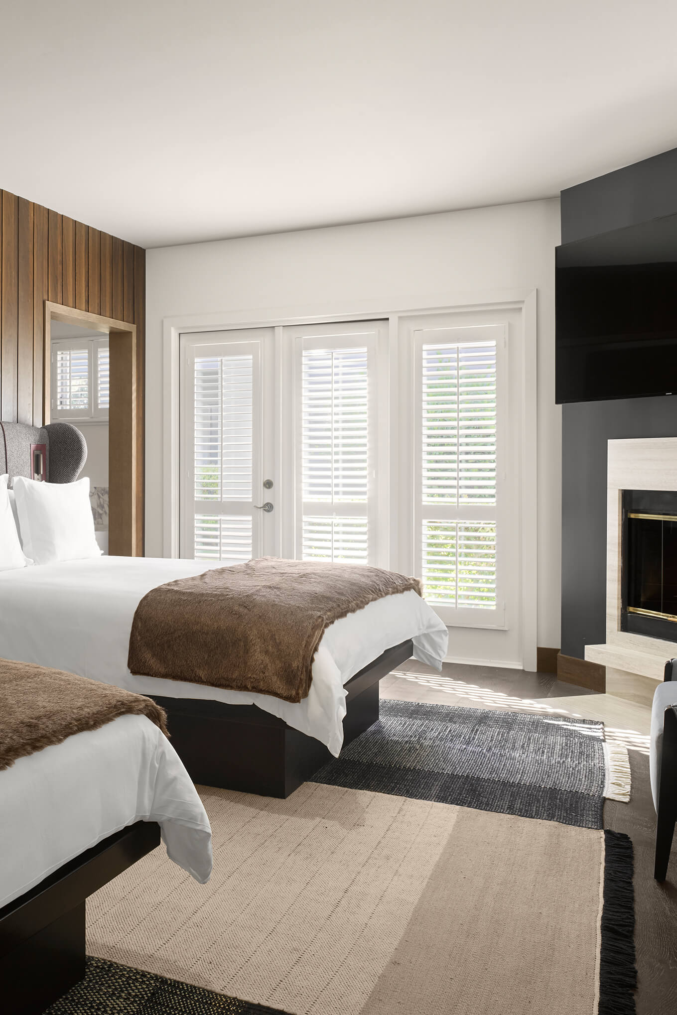 La emblemática alfombra Tres black de Nanimarquina es un ejemplo. Las habitaciones del hotel boutique, cuidadosamente diseñadas como retiros refinados, cuentan con terrazas soleadas con vistas a los pintorescos viñedos de Napa y a los terrenos ajardinados de The Estate.
