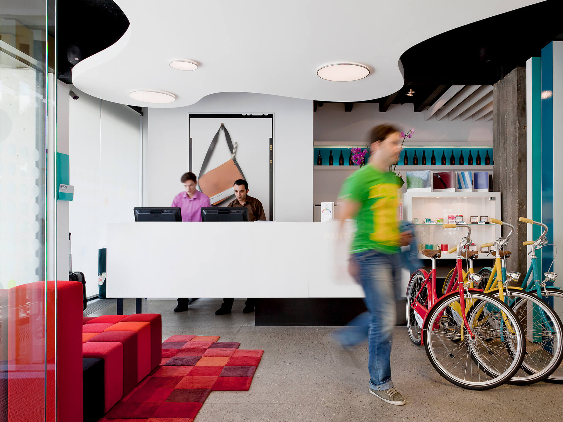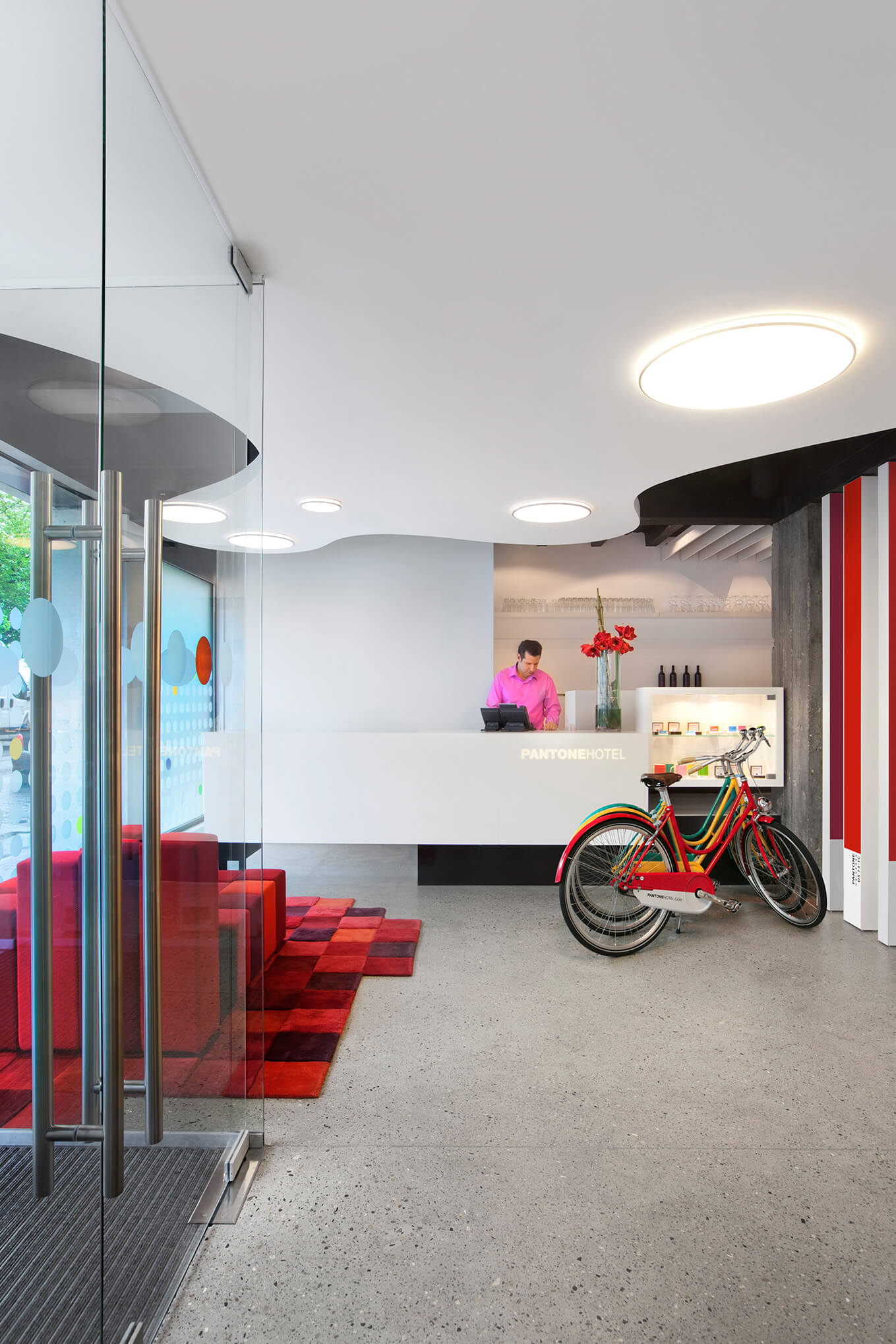 Manteniendo la obsesión por el color en el área del vestíbulo, la alfombra Do-Lo-Rez se convierte en la combinación perfecta, que recuerda a la identidad gráfica de Pantone.