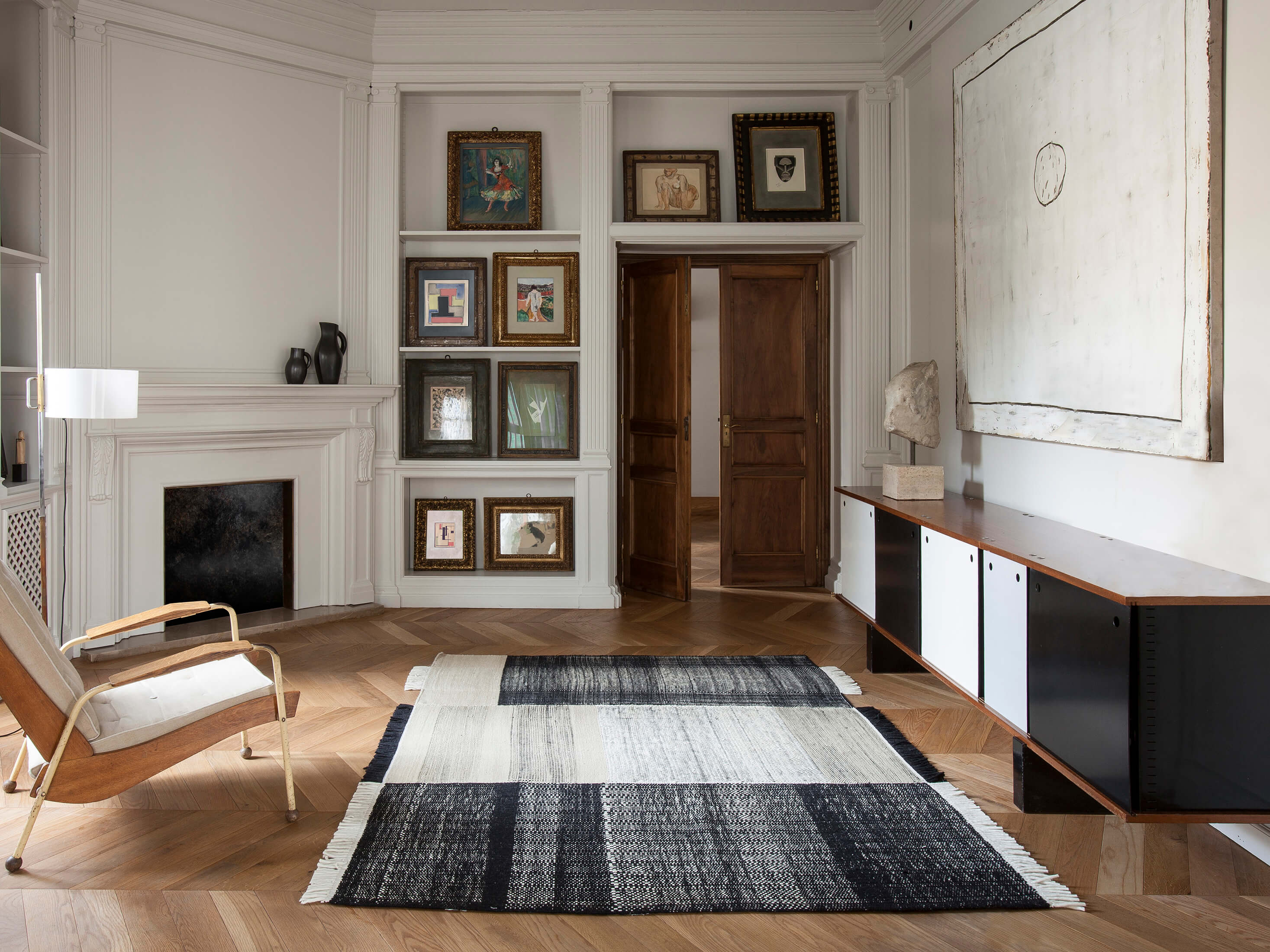 Tres es una alfombra tradicional india de tejido plano Dhurrie. Su cualidad única reside en la elaboración de tres partes independientes en las que predominan fibras diferentes. La proporción y la combinación de lana, fieltro y algodón generan cambios de tono e irregularidades en el tejido, dando vida al patrón.La colección es un ejercicio de honestidad, mostrando la estructura del tejido casi con un estilo pedagógico, sin miedo a revelar la urdimbre. Los flecos también ayudan a entender el proceso de construcción, potenciando la diferenciación entre las tres piezas que finalmente se funden de forma invisible.