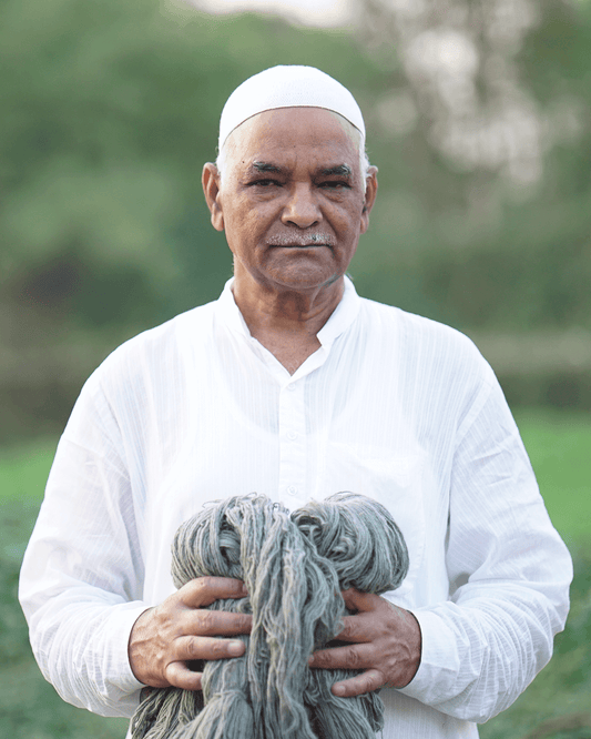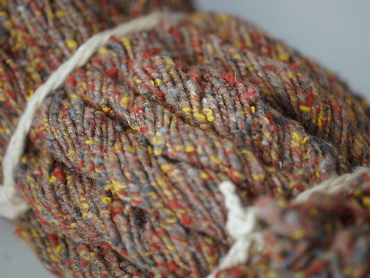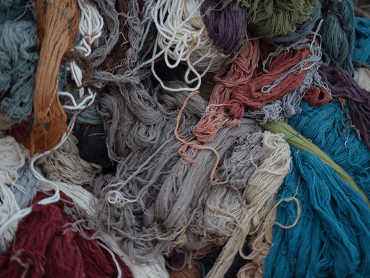 We create the yarn by hand from recycled fiber through a process of rotating and stretching it.