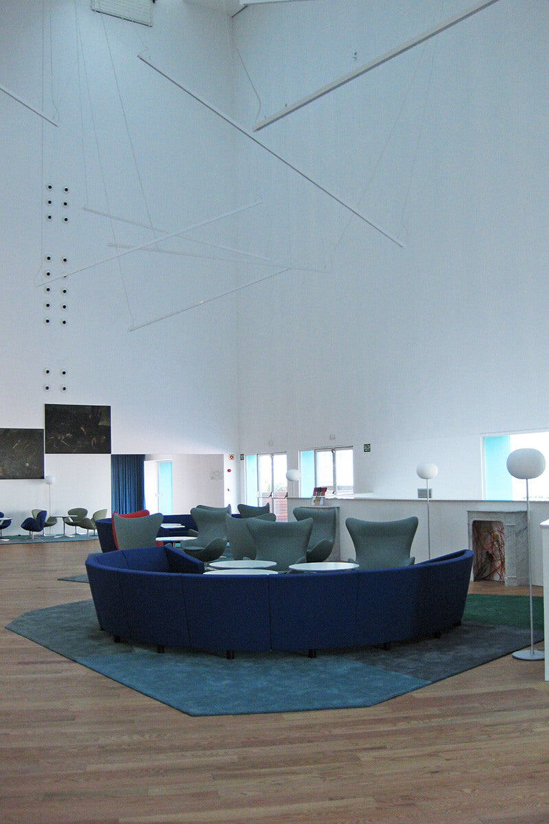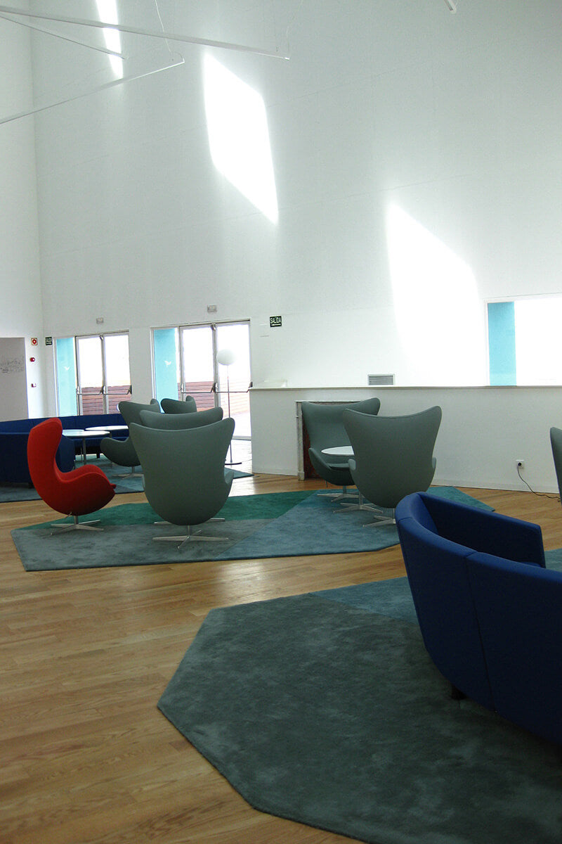 The architect Elías Torres was the architect of the concept behind the Hiberus hotel: water. For this reason, various rugs were made, creating a collage with the tones of water. The result was an immense patchwork of irregular carpets following the template of one of the hotel's interior patios.