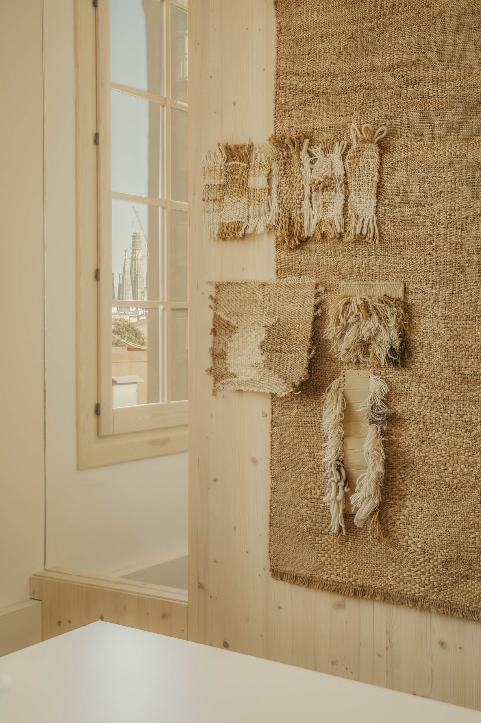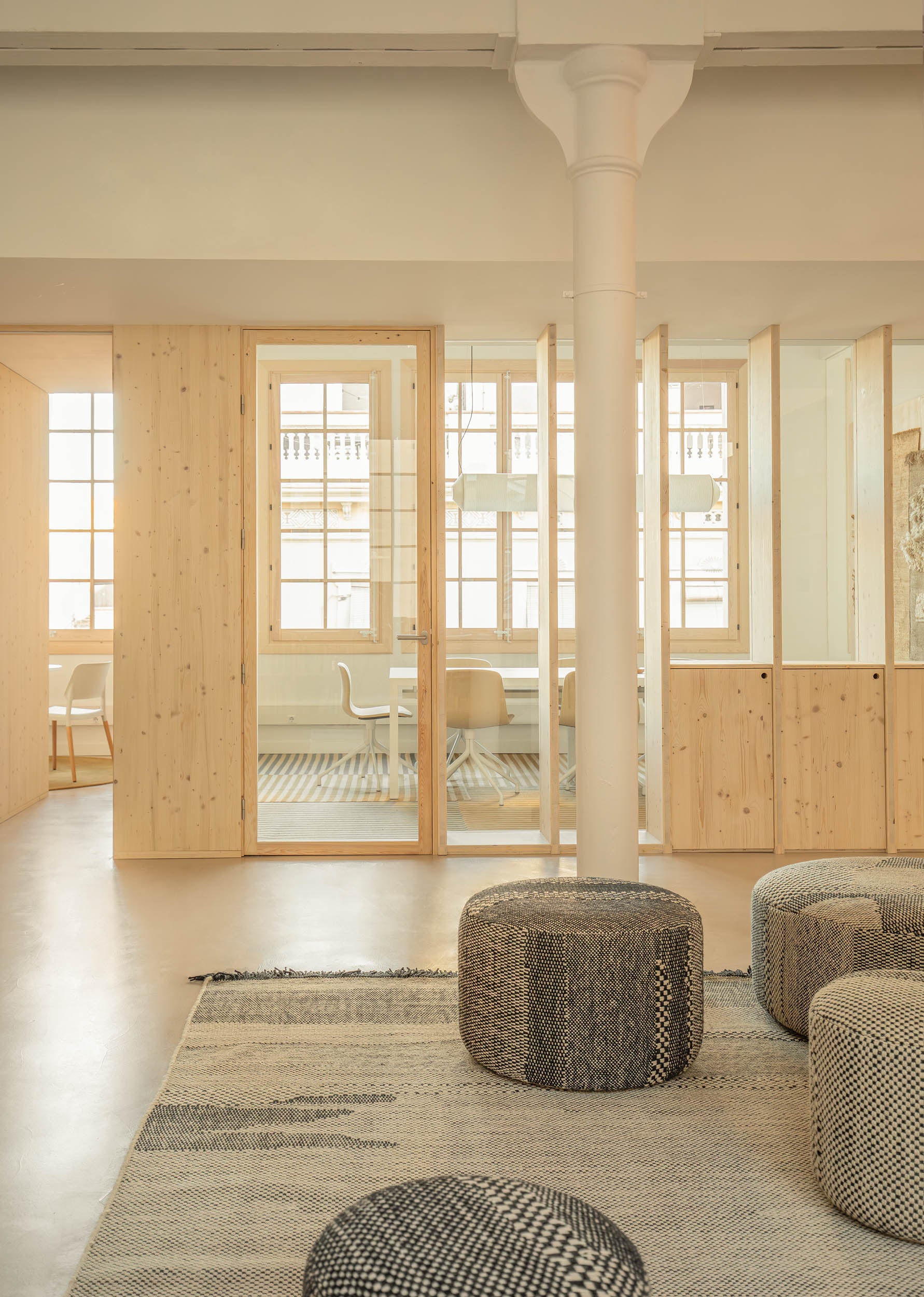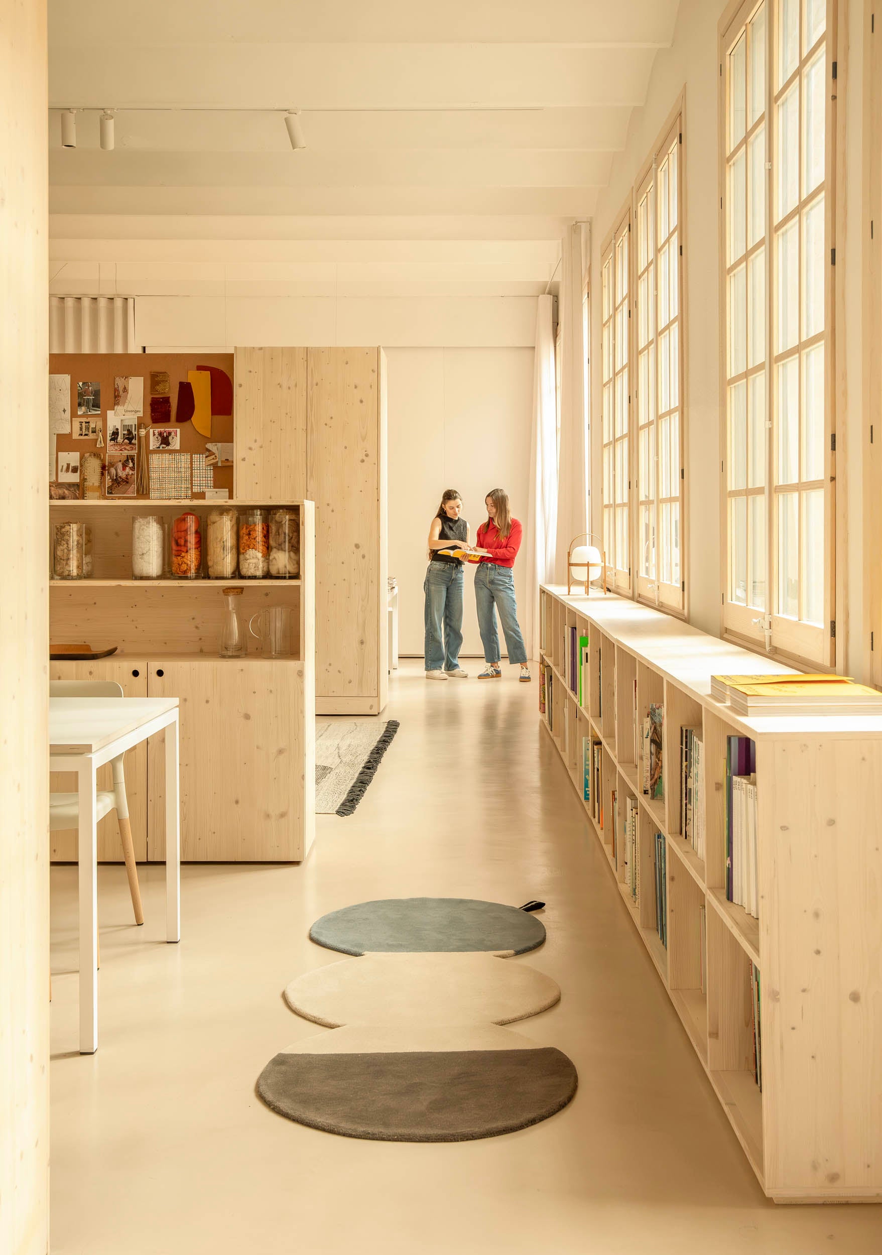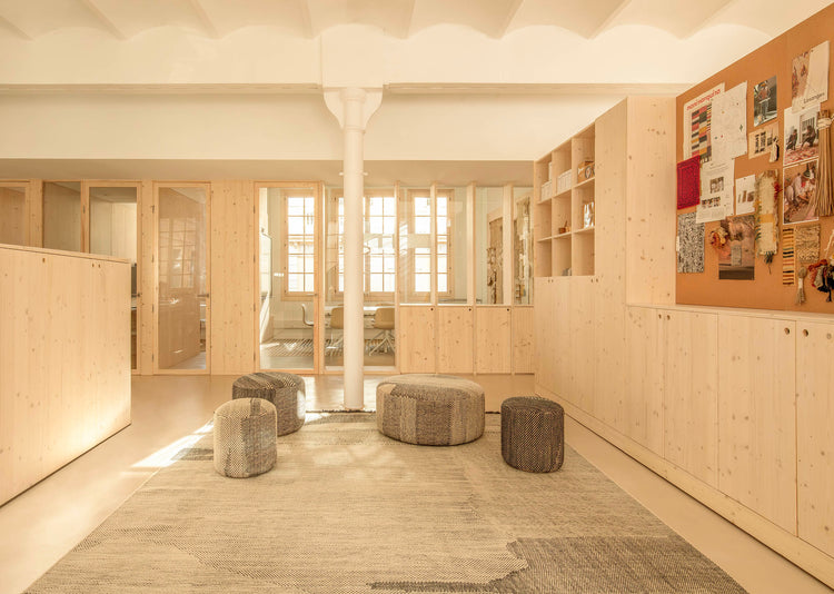 Inspired by the aesthetics of natural, pure materials, with clear influences from Mediterranean and Nordic design, the project aimed to create a functional, comfortable, and healthy workspace, with efficient climate control, proper soundproofing, and maximum well-being. Abundant natural light floods the interiors, highlighting the warmth of pine wood and the neutrality of beige microcement, materials chosen to keep the atmosphere light and understated, allowing the nanimarquina rugs to become the true protagonists of space.