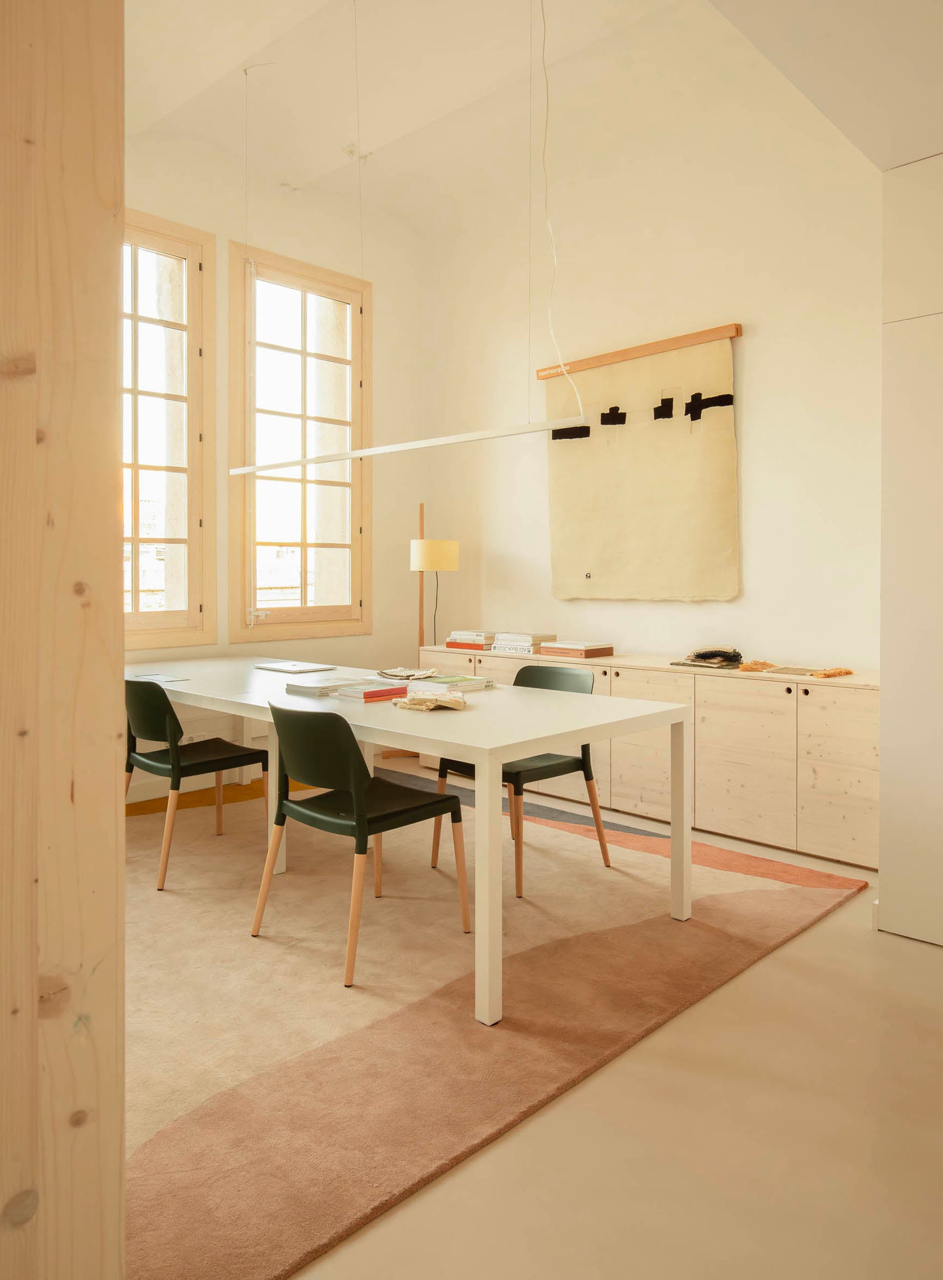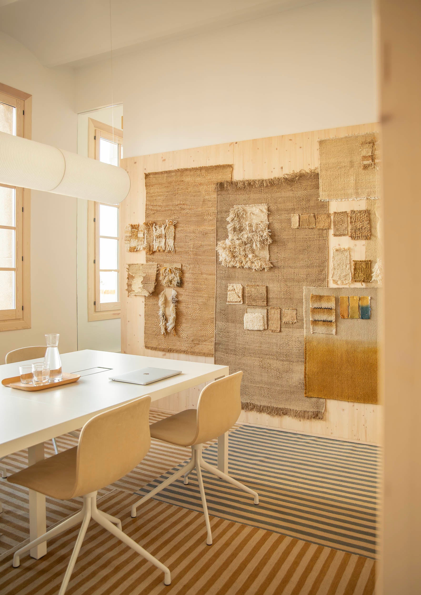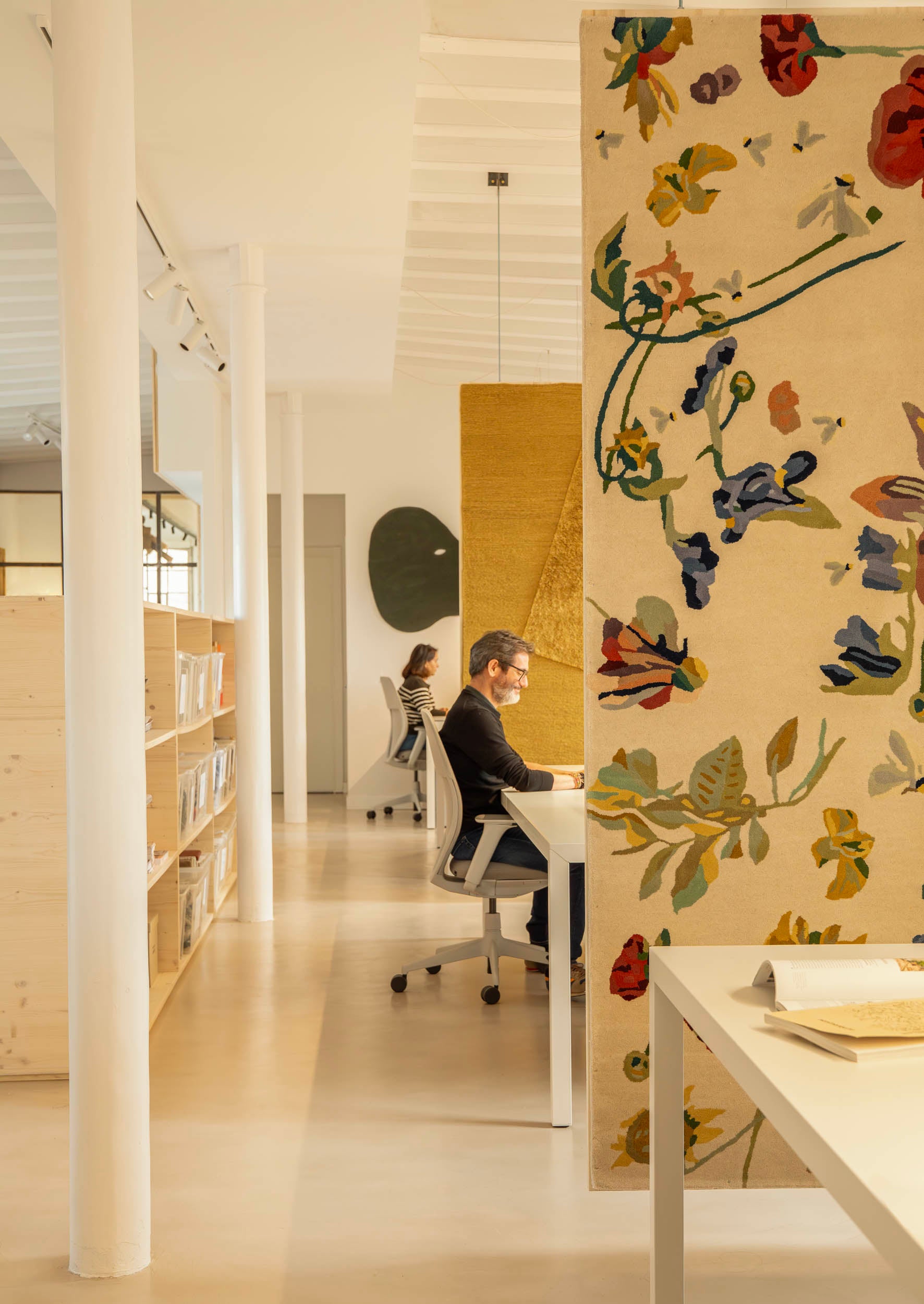 For the furniture, brands with a design philosophy aligned with that of nanimarquina were chosen, along with a strong commitment to sustainability: Santa & Cole lamps, made from environmentally friendly and locally sourced materials, and Vitra office chairs, fully recyclable and ergonomic, combining the functionality and comfort sought for the project.