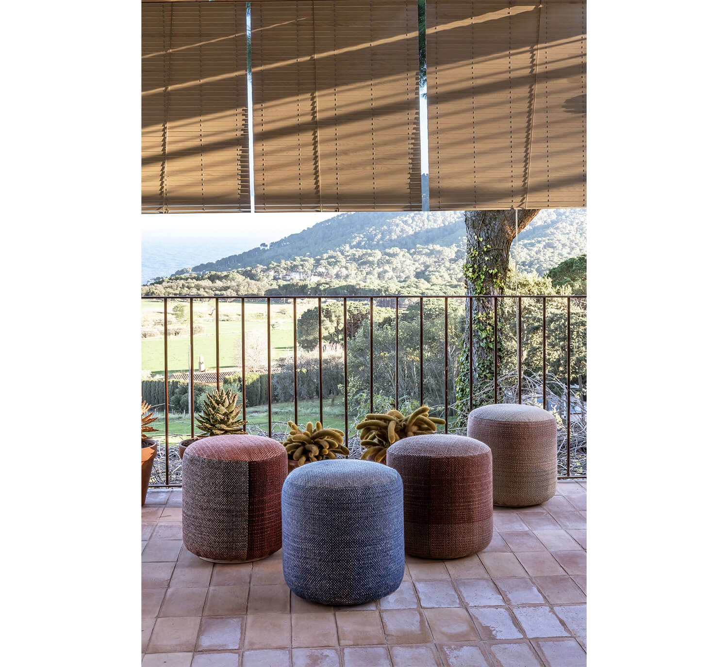 This cylindrical sitting accessory is light, handy and comes in eight different color varieties. Each rug is combined with two upholstered poufs with the main color gradients.