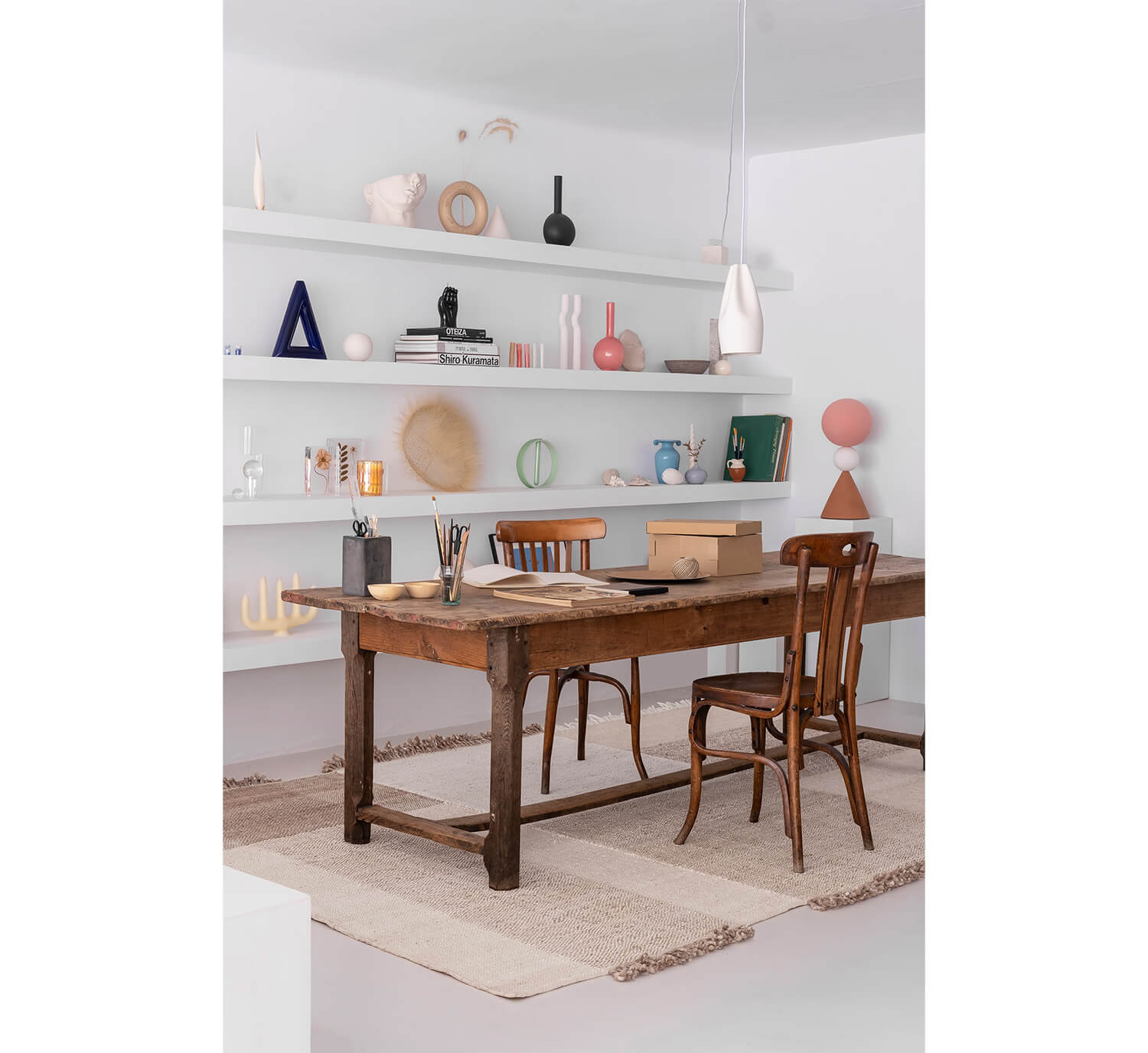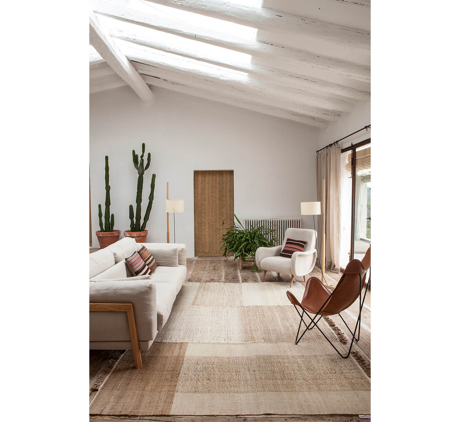 The beauty of this collection, a flat weave created in India, lies in the irregularities generated by the crossing of the fibres and their different thicknesses, but also in the shades of beige, ivory or off-white fibres.