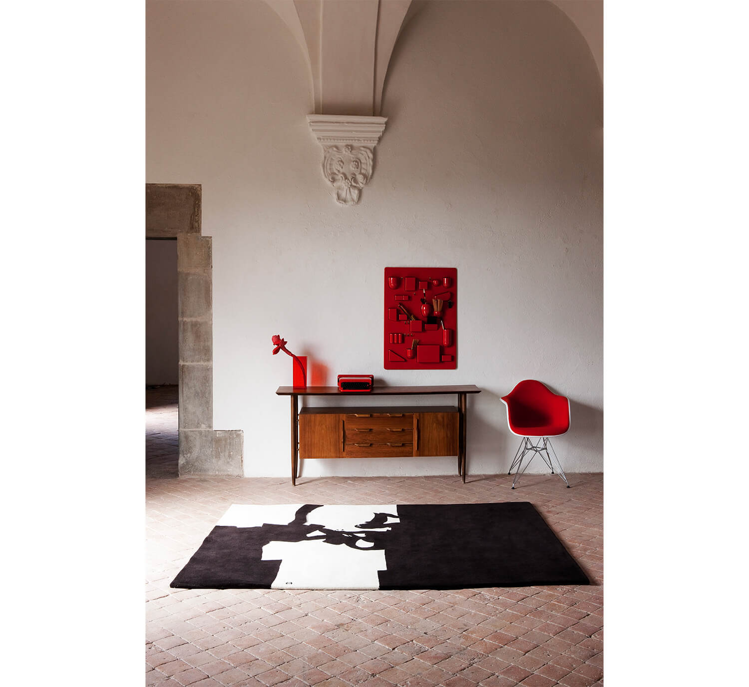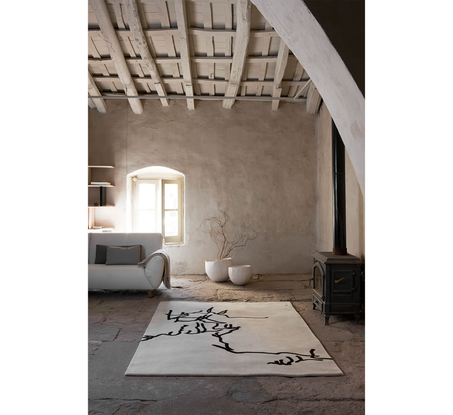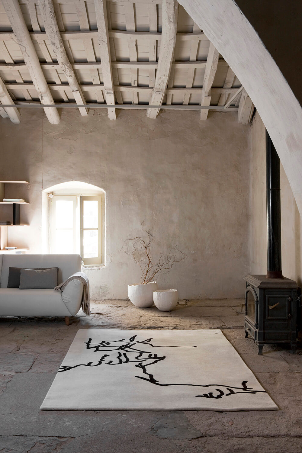 Transformed into a rug, Drawing Tinta 1957 is an elegant composition in which the artist's unique stroke is recognized. An indoor rug hand-woven with New Zealand wool using the hand tufted technique.