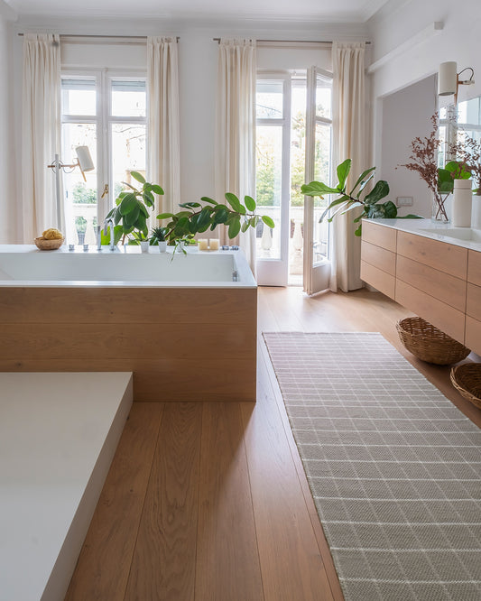Aunque es menos frecuente, una alfombra puede completar muy bien las zonas de baño. Aportando confort en ciertas zonas, separando la zona de aguas del resto o indicando la entrada a una nueva estancia.
