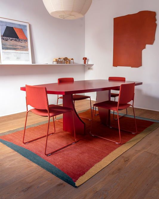 El tamaño de la alfombra debería ser proporcional al tamaño de la mesa e idealmente un poco mayor para que las patas de atrás de las sillas no sobresalgan de la alfombra una vez sentados.