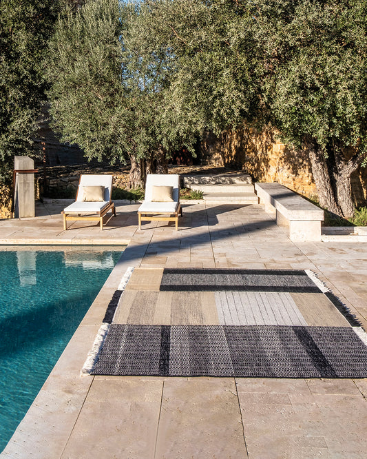Una alfombra de exterior puede ser una gran compañera también para zonas de piscina en las que queramos aportar color y personalidad.