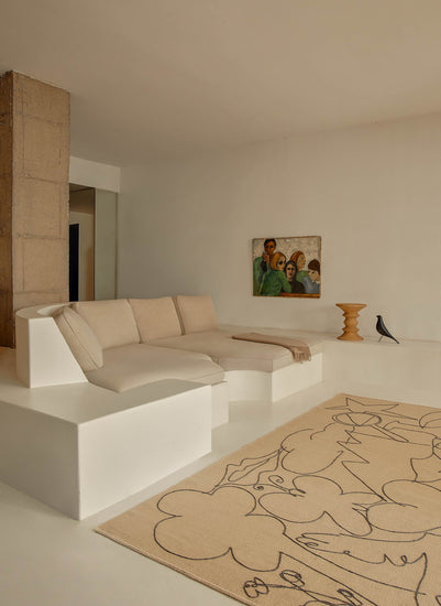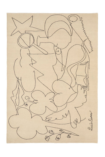 La alfombra combina tejido kilim con bordado, superponiendo el dibujo sobre una base neutra como si se tratara de una hoja en blanco. Esta técnica permite recrear el trazo con precisión, aportando una lectura ligera y gráfica donde los elementos parecen flotar sobre la superficie.