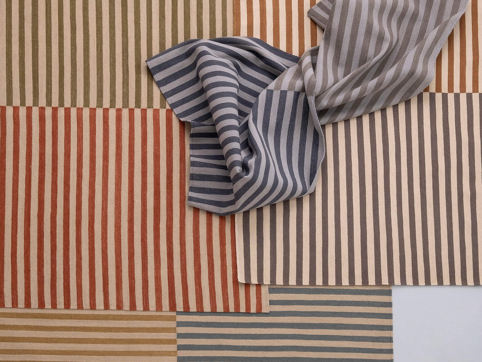 Ceras surge del estudio exhaustivo del color a través del proceso manual de trazar con ceras. Un proceso intuitivo e instintivo, la búsqueda del equilibrio mediante tres colores y rayas en repetición. Una alfombra de interior durable y resistente, y a su vez muy ligera.