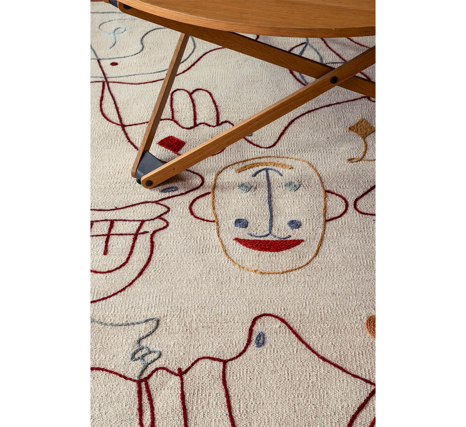 Los personajes imaginarios del artista y diseñador Jaime Hayon cobran vida a través de la técnica del bordado. Un laborioso proceso hecho a mano que añade textura y un suave volumen enfatizando la sinuosidad del dibujo.