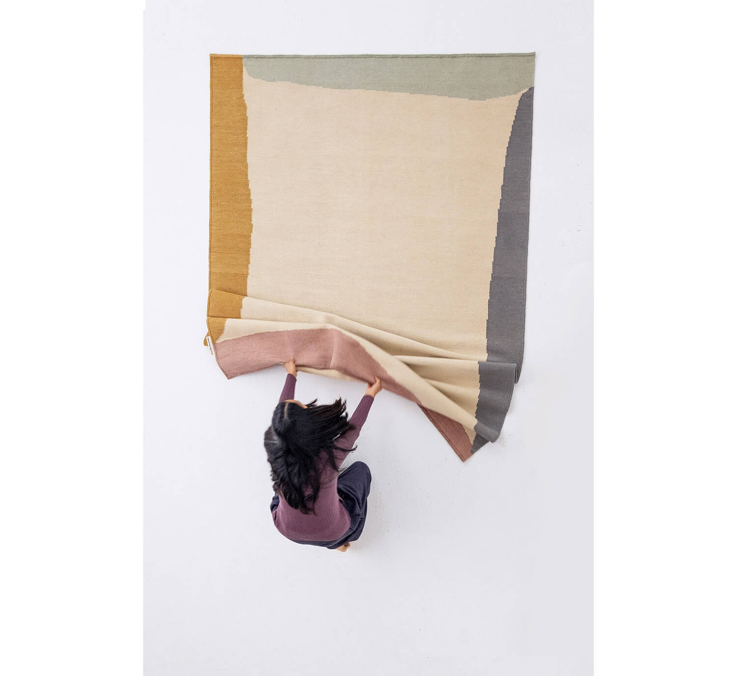 Claudia Valsells cambia su medio habitual, la pintura, para diseñar Tones. A través de un uso magistral del color, la artista sintetiza las formas, distribuyéndolas a los extremos y dejando un espacio central que llama la atención, invitando al usuario o a los elementos del mobiliario a dirigirse al centro de la alfombra.